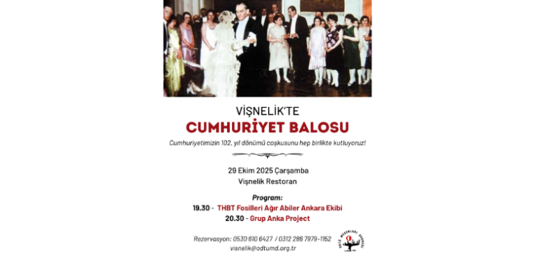 ODTÜ Mezunları Derneği olarak, Cumhuriyetimizin 102. yıl coşkusunu hep birlikte kutluyoruz! Programımız; 19.30’da “THBT Fosilleri Ağır Abiler Ankara Ekibi”nin sahne almasıyla başlayacak ve 20.30’da Grup