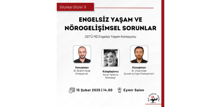 ODTÜ Mezunları Derneği Engelsiz Yaşam Komisyonu söyleşi dizisinin beşincisi 15 Şubat 2025 Cumartesi günü saat 14.00’te gerçekleştirilecektir. Psikiyatri Uzmanı İbrahim Aylak, Dr. Cihan Aslan ve kolaylaştırıcı Psikolog