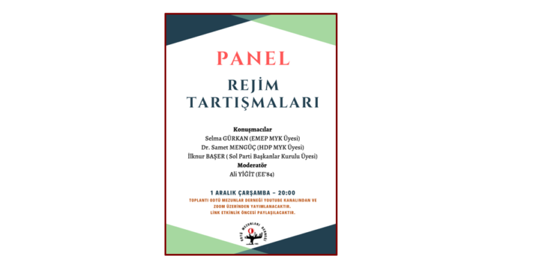 1 Aralık 2021 Çarşamba günü saat 20.00’da Youtube ve zoom üzerinden “Rejim Tartışmaları” gündemi ile panel gerçekleşecektir. Panelimize tüm üyelerimizin katkı ve katılımını bekliyoruz. Konuşmacılar Selma GÜRKAN (EMEP MYK Üyesi) Dr. Samet MENGÜÇ