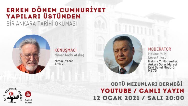 12 Ocak 2021 Salı günü saat 20:00’de, Sayın Levent TOSUN’nun moderatörlüğünde Sayın Kadri ATABAŞ (ARCH’70) ile gerçekleştirilecek “ERKEN DÖNEM CUMHURİYET YAPILARI ÜSTÜNDEN BİR ANKARA TARİHİ
