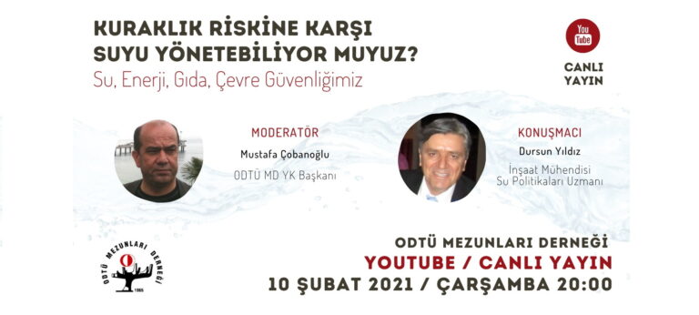 10 Şubat 2021 Çarşamba günü saat 20.00’de, Sayın Mustafa ÇOBANOĞLU’nun moderatörlüğünde, Sayın Dursun YILDIZ ile gerçekleştirilecek “KURAKLIK RİSKİNE KARŞI SUYU YÖNETEBİLİYOR MUYUZ?” başlıklı söyleşiye katılımınızı