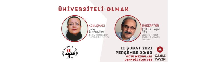 11 Şubat 2021 Perşembe günü saat 20.00’de, Sayın Prof. Dr. Doğan Tılıç‘ın moderatörlüğünde, Sayın Gölay Şakiroğulları ile gerçekleştirilecek “Üniversiteli Olmak” başlıklı söyleşiye katılımınızı bekliyoruz. Buluşmak