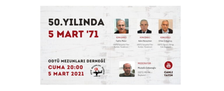 “50. Yılında 5 Mart’71” konulu söyleşimiz, Aşkın KOCAÇİMEN’in moderatörlüğünde, Erhan Erdoğmuş ve Tayfun MATER ile 5 Mart 2021 Cuma günü saat 20.00’de gerçekleştirilecektir.Buluşmak dileği ve
