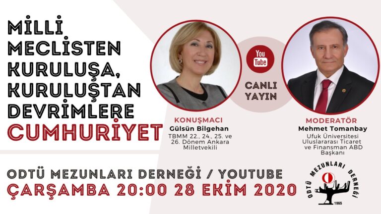 28 Ekim 2020 Çarşamba günü saat 20:00’de YouTube üzerinden Prof. Dr. Mehmet TOMANBAY moderatörlüğünde, Gülsün BİLGEHAN ile “MİLLİ MECLİSTEN KURULUŞA KURTULUŞTAN DEVRİMLERE CUMHURİYET” başlıklı söyleşi gerçekleştirilecektir. Buluşmak dileği ve