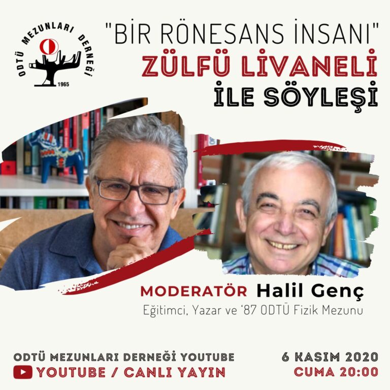 6 Kasım 2020 Cuma günü saat 20:00’de YouTube üzerinden Halil GENÇ moderatörlüğünde, Zülfü LİVANELİ ile BİR RÖNESANS İNSANI başlıklı söyleşi gerçekleştirilecektir. Buluşmak dileği ve saygılarımızla, Program Tarih: 6 Kasım 2020, Cuma Saat: 20:00 SÖYLEŞİYE KATILMAK