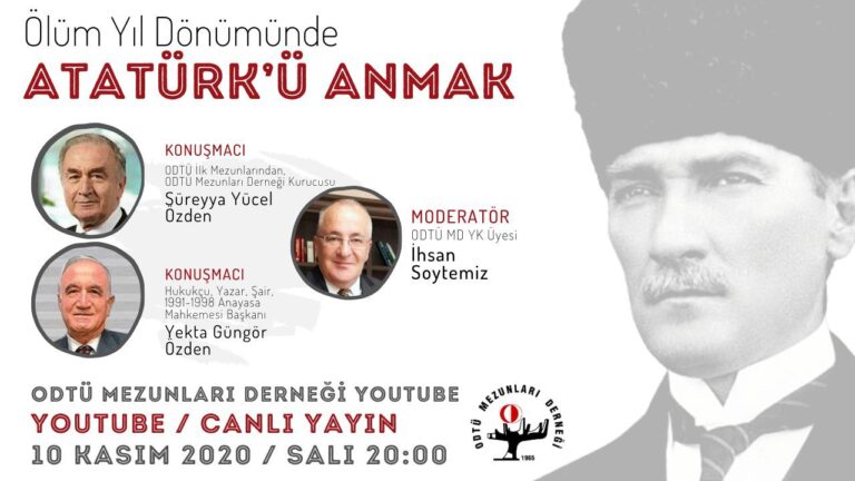 10 Kasım 2020 Salı günü saat 20:00’de YouTube üzerinden İhsan SOYTEMİZ moderatörlüğünde, Süreyya Yücel ÖZDEN ve Yekta Güngör ÖZDEN ile “ÖLÜM YIL DÖNÜMÜNDE ATATÜRK’Ü ANMAK” başlıklı söyleşi gerçekleştirilecektir. Buluşmak dileği