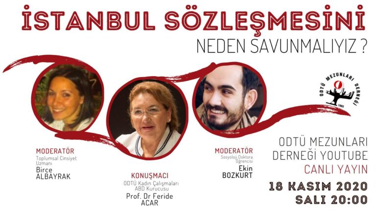 18 Kasım 2020 Çarşamba günü saat 20:00’da YouTube üzerinden Birce ALBAYRAK ve Ekin BOZKURT moderatörlüğünde, Prof. Dr. Ferice ACAR ile “İSTANBUL SÖZLEŞMESİNİ NEDEN SAVUNMALIYIZ?” başlığını konuşmak için bir araya geliyor.