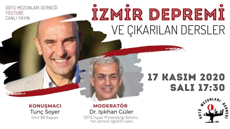 17 Kasım 2020 Salı günü saat 17:30’da YouTube üzerinden Dr. Işıkhan GÜLER moderatörlüğünde, Tunç SOYER ile “İzmir Depremi ve Çıkarılan Dersler” başlığını konuşmak için bir araya geliyor. Buluşmak dileği ve
