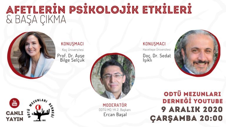 9 Aralık 2020 Çarşamba günü saat 20:00’da YouTube üzerinden Ercan BAŞAL moderatörlüğünde Prof. Dr. Ayşe Bilge SELÇUK ve Doç. Dr. Sedat IŞIKLI ile “AFETLERİN PSİKOLOJİK ETKİLERİ & BAŞA