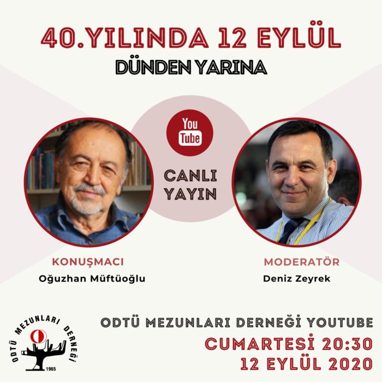 SÖYLEŞİ 40.YILINDA 12 EYLÜL DÜNDEN YARINA Değerli Üyelerimiz Merhaba, 12 Eylül 2020 Cumartesi günü saat 20:30’da YouTube üzerinden Deniz ZEYREK moderatörlüğünde, Oğuzhan MÜFTÜOĞLU ile “40.