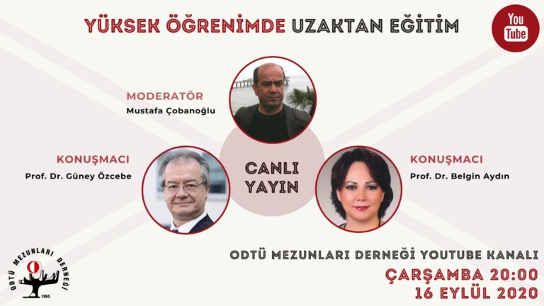 16 Eylül 2020 Çarşamba günü saat 20:00’de YouTube üzerinden Mustafa ÇOBANOĞLU moderatörlüğünde, Prof. Dr. Güney ÖZCEBE ve Prof. Dr. Belgin AYDIN ile “Yüksek Öğrenimde Uzaktan