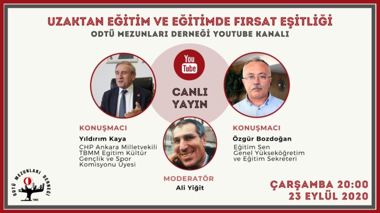 23 Eylül 2020 Çarşamba günü saat 20:00’de YouTube üzerinden Ali YİĞİT moderatörlüğünde, Yıldırım KAYA ve Özgür BOZDOĞAN ile “UZAKTAN EĞİTİM VE EĞİTİMDE FIRSAT EŞİTLİĞİ” başlıklı