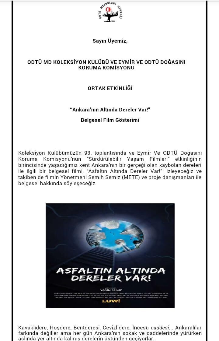Bu ortamların ankara kenti için doğal su rejimi ve önemli bir hava koridoru oluşturma, iklimi dengeleme özellikleri, kentte ve bölgedeki canlı türü çeşitliliği açılarından ankara’nın vazgeçilemez bir doğa değeri olduğunu kamuoyuna anlatmak üzere etkinlikler düzenler.