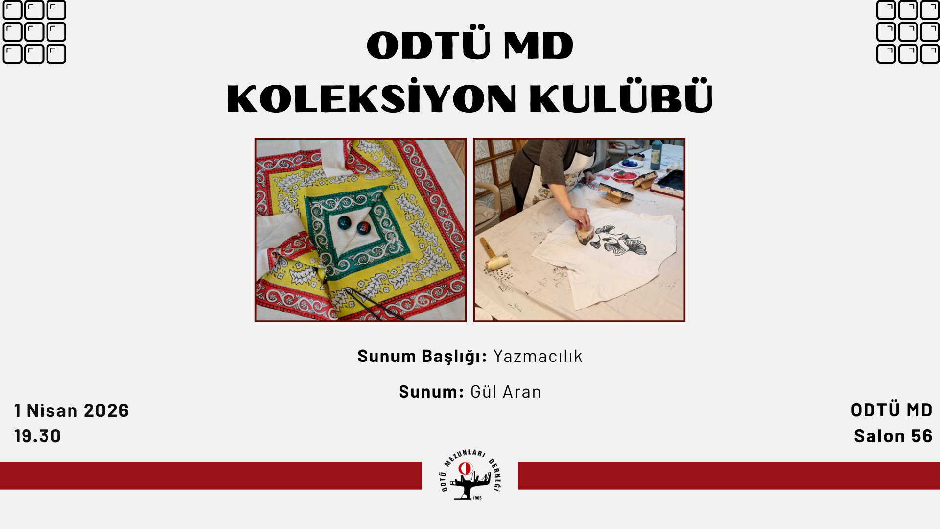 ODTÜ Mezunları Derneği bünyesinde uzun süredir çalışmalarını sürdüren Koleksiyon Kulübü 170. toplantısıyla yeni dönem çalışmalarına devam ediyor. 1 Nisan Çarşamba akşamı saat 19.30’da Salon 56’da gerçekleşecek toplantıda İnşaat Mühendisi ve Sanatçı Gül Aran, 2025 yılında Kayseri Kültür Yolu Festivali kapsamında Talas’da, Kayseri’ye özgü desenler ile atölye çalışması yapılan ve sergilenen “Yazmacılık” konusunda sunum yapacaktır.