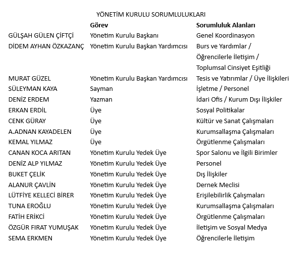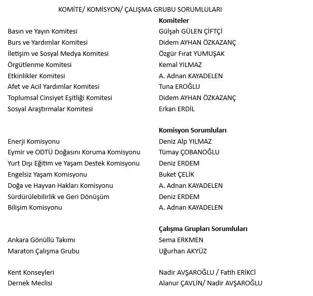 Derneğimiz Yönetim Kurulu Üyelerinin sorumluluk alanları ve Komite, Komisyon ve Çalışma Gruplarından sorumlu GYK üyelerimiz aşağıdaki şekilde belirlenmiştir.