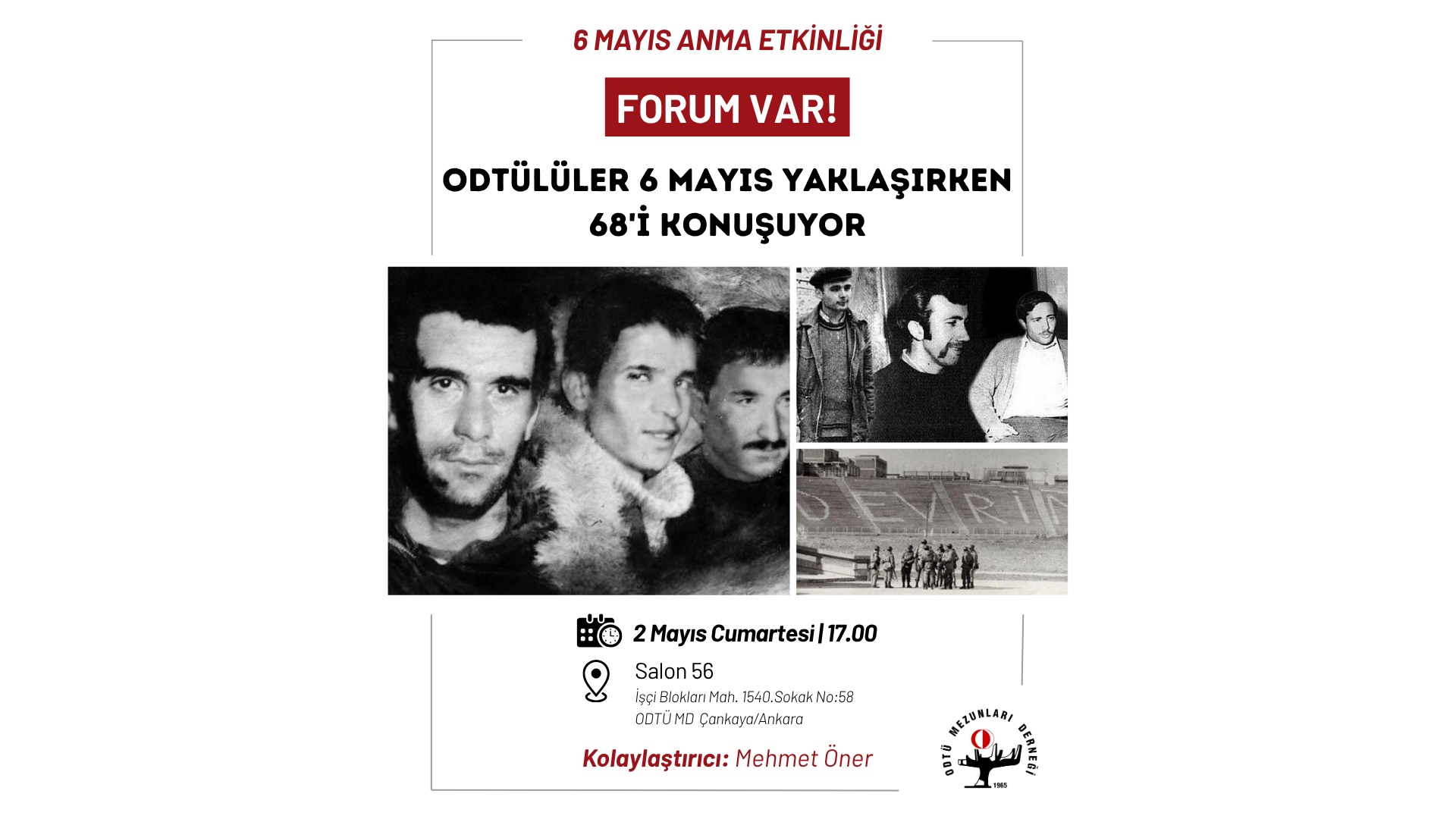 2 Mayıs Cumartesi günü saat 17.00’de, ODTÜ MD Vişnelik Tesisi Salon 56’da “68’liler Bugünü ve Yarını Nasıl Değerlendiriyor?” başlığı altında düzenleyeceğimiz ve kolaylaştırıcılığını Mehmet Öner’in yapacağı forumda, tarihsel mirasın geleceğe aktarılması hedeflenmektedir.