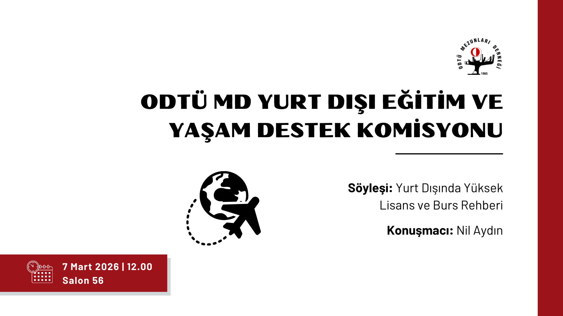 ODTÜ Mezunları Derneği bünyesinde faaliyet gösteren Yurt Dışı Eğitim ve Yaşam Destek Komisyonu’muzun çalışmaları kapsamında yapılacak ve mezunumuz yurt dışı eğitim uzmanı Nil Aydın‘ın konuşmacı olarak katılacağı “Yurt Dışında Yüksek Lisans ve Burs Rehberi” konulu yüz yüze söyleşi ile bir araya geliyoruz.