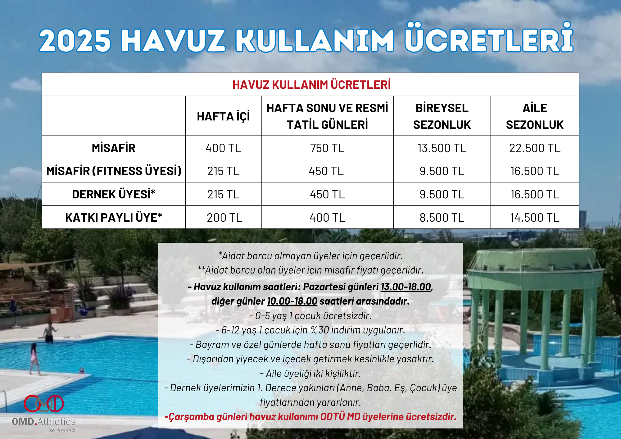 Çarşamba günleri havuz kullanımı ODTÜ MD üyeleri için ücretsizdir.